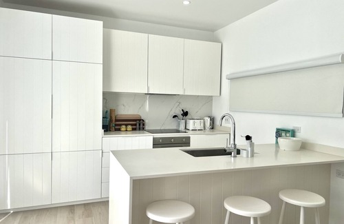 From the dining area, you can flow seamlessly into the adjacent handmade adorned white marble kitchen. The kitchen is fully equipped with integrated appliances, to meet your culinary needs during your stay. The large island in the center of the kitchen features three breakfast stools and a conveniently located outlet, making it a versatile space that can be used as a workspace or a social gathering spot.