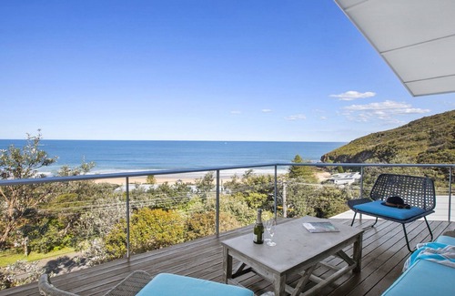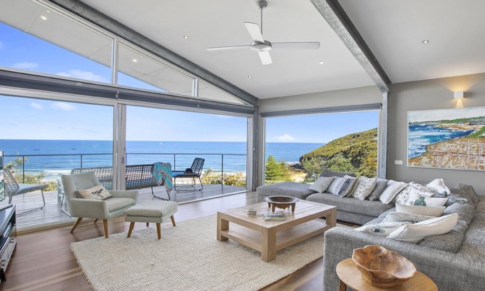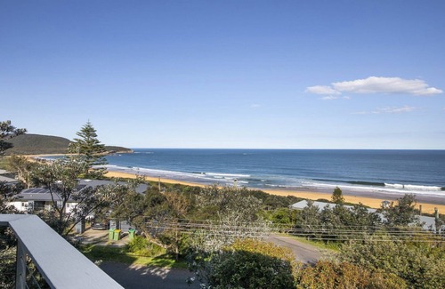 This architecturally designed beach house captures the stunning ocean views from Killcare to Putty Beach over three levels and offers the ultimate in contemporary, beach-side living. The top floor has the convenience of a powder room, the fully equipped recently refurbished kitchen with gas cooking and two fridges, a reading lounge with work station and of course the spectacular dining area with seating for 12. Both lounge areas open up to outdoor entertaining areas that capture both the beach and bush vistas. The BBQ and outdoor setting is perfect for balmy summer evenings.