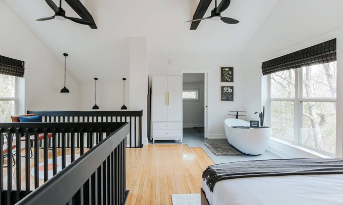 ~luxurious soaking tub with captivating tree views