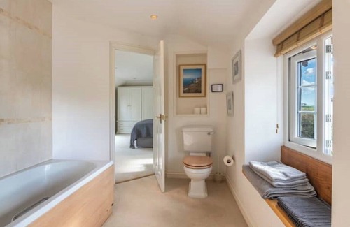 The Old Cheesehouse is surrounded by beautiful countryside, fabulous views and amazing walks. Deceptively spacious the house has 3 bedrooms and 3 bathrooms, a large kitchen-dining room, a mezzanine work space and a super space for pets to dry off or snooze quietly with underfloor heating. The stream through the garden is mesmerizing from the bridge, and walks for miles around right from the door. Located at the end of a no through country lane, yet in easy walking distance of the town.