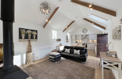 The interior comprises an open-plan kitchen, dining, and living area with a vaulted ceiling and Velux windows, providing a bright and airy feel. The lounge includes a modern sofa, log burner, TV, and DVD player. The kitchen and dining area is fully equipped for self-catering stays.