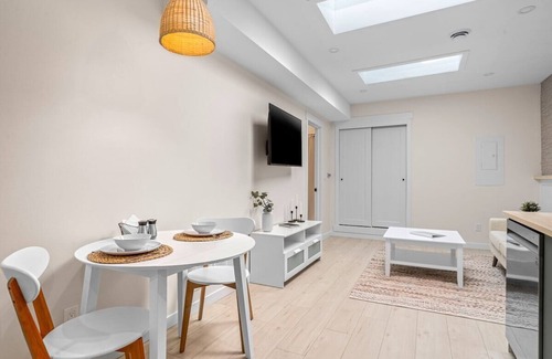 The Olympia features a cozy, modern open concept living and dining area, one bedroom, and one bathroom with skylights throughout. The bedroom features a Queen-size bed, skylight and a workspace which includes a desk and chair. Laundry machines are provided for your use located in the bedroom closet. The kitchen is fully equipped with stainless steel appliances, basic cookware, dinnerware, and small appliances including a Keurig for your morning coffee.