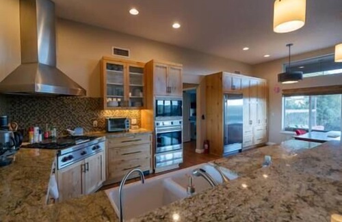 The bedrooms offer cozy Queen beds and red rock views from every window. The Master suite has a steam shower and private access to the backyard/spa with views of the garden. The stocked Gourmet kitchen looks over the living room and dining room providing wonderful opportunity for gatherings. Large windows allow natural light to pour in north to south and the living room has comfy oversized couches suitable for sleeping.