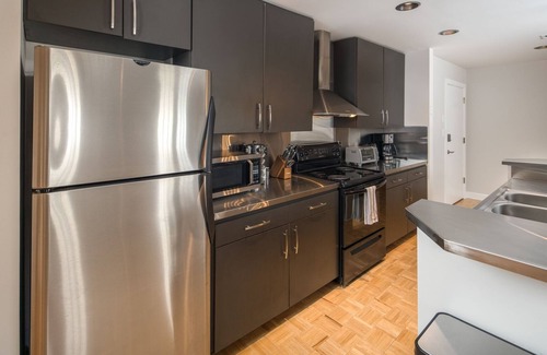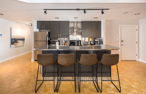 Stay for a weekend or a month or two--this downtown aerie offers deluxe accommodations in a spacious upstairs apartment featuring a graciously sized living area, full kitchen, beautiful baths, and a King master suite plus a Queen Murphy bed in the den, which has a door for privacy, and a Queen sleeper sofa in the living area. Overlooking Sunset Street and steps from Main Street, this unit also offers elevator access and a reserved parking spot nearby. Enjoy people-watching from your balcony and relish the condo's proximity to village shops and restaurants, and the town park. Art in the Park and Music on the Lawn are just a stroll away during the summer/fall season.