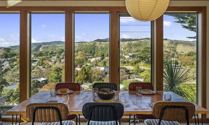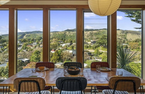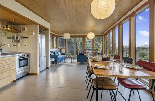Indoors admire the view from the large, floor-to-ceiling, wood-framed windows in the open plan living, dining and kitchen area. A mix of modern and retro furnishings give the place a warm ambience, ideal for downtime together or meals shared with a view.