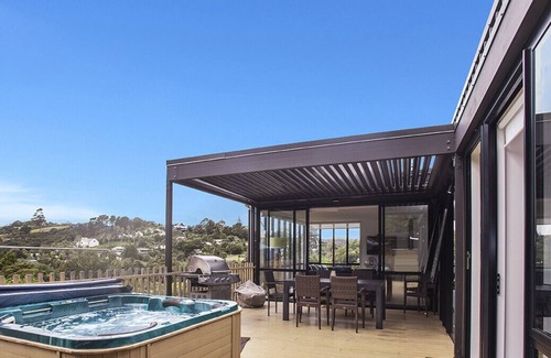 The Palm Beach Treehouse is an upmarket 3 bedroom, 2 bathroom Palm Beach luxury holiday house on Waiheke Island. This modern and well appointed holiday house enjoys fantastic indoor/outdoor living across 2 levels, plus the added convenience of a vehicle during your stay.
