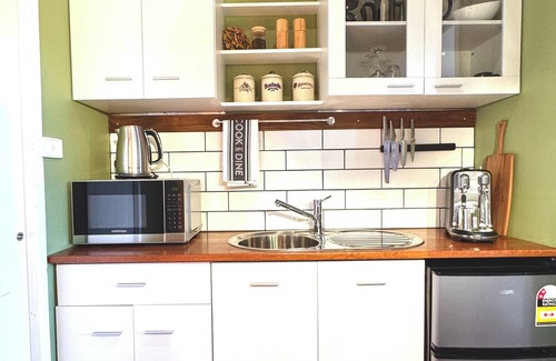 A well-equipped kitchenette provides everything for simple meals, including a fridge, microwave, toaster, multi cooker, small air fryer, rice cooker, electric wok and Nespresso pod machine. The side burner on the bbq can be used as stove top. Whole house water filter fitted so all water is drinkable.