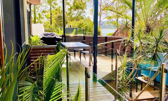 The Palm Tree Loft, a private, self-contained top-level open plan retreat in Green Point. Lake is at road end, 5 mins drive to Erina Fair, 2 mins drive to Green Point shops and Six Strings Brewery, 12 mins drive to Avoca, Terrigal & Copacabana beaches. Enjoy lake glimpses from the balcony, queen bed ( + pull-out couch for a 3rd and 4th person) bath w 2 sinks, kitchenette, Weber BBQ w side burner, Nespresso, appliances, TV, air-con & fans.
