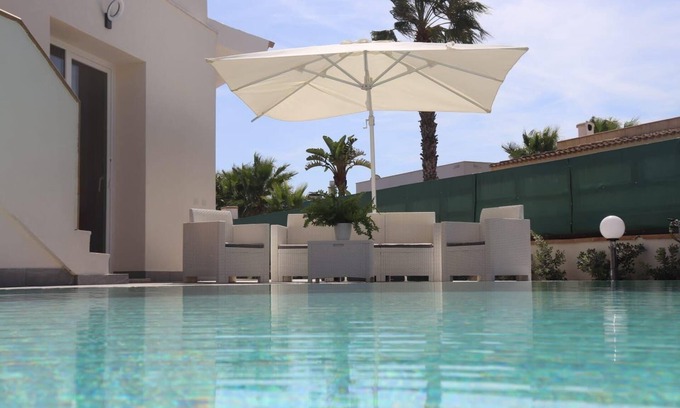 "The Pearl of Sicily" is one of the RARE and UNIQUE villas in Sicily with a NEW PRIVATE INFINITY POOL with salt water and lawn garden ONLY 50m away from the sea. This.detached house is very close to the beach in the South-West side of Sicily. It is located in TRE FONTANE, the longest and large beach in Sicily ( 13km) and close to Mazara del Vallo in a tranquil setting along a not-often used road..