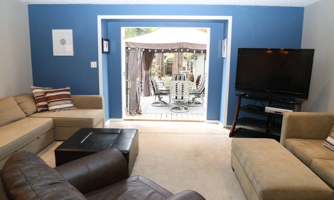The living room has a large smart TV with HDMI connections as well as a DVD player. High speed Wi-Fi is included in the rate. The living room has a natural gas fireplace and French doors that open on to a large deck. The deck has a covered natural gas barbeque, a large gazebo that has lights for the evenings and also an open area that is ideal for sitting by the propane bowl. There is also a wood burning firepit available for use during the spring and fall when there is normally not a fire ban in place.