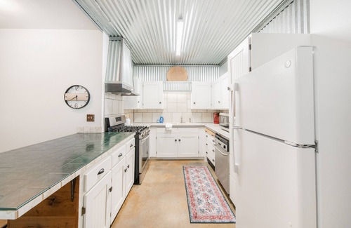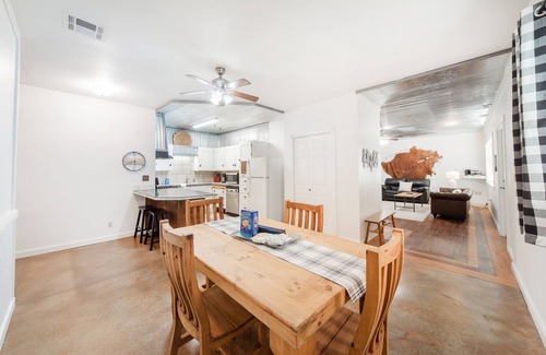 This cute ranch style house is located right in the middle of all the action in downtown Eufaula. It is close to a swimming pool at Extreme, Yogi Bear Jellystone Park, Eufaula Cove Marina, boat docks and beaches. Eufaula is a golf cart community. options. The Ranch House is a three bedroom two bath home. Two rooms have queen size beds and one has full size bunk beds with a twin trundle. It has a fully equipped kitchen.