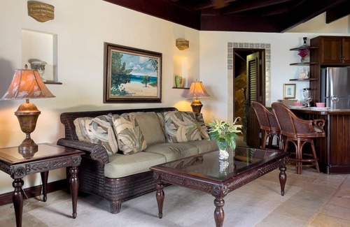 Within this Danish Tower design, The Honeymoon Suite is a spacious 1000 sq ft. 1BR/1BA designed in old-world elegance. The comfortable living room, and large exterior balcony look out to the magnificent Caribbean. The lovely bedroom with its curved walls taking on the circular shape of the exterior mill design has a romantic, king size four poster bed. There is a full kitchen with a breakfast bar, and alfresco dining on the ocean view balcony with a dining table for 4. The spacious bathroom with garden shower is designed in beautiful island stone & classic tile.