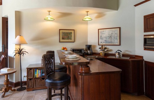 Within this Danish Tower design, the upper level Penthouse Suite is a spacious 1000 sq ft. 1BR/1BA designed in old-world elegance. The comfortable living room, and large exterior balcony look out to a spectacular Caribbean view. The lovely bedroom with its curved walls taking on the circular shape of the exterior mill design has a romantic, king size four poster bed. There is a mini-kitchen with microwave, a breakfast bar, outdoor grill, and alfresco dining on the ocean view balcony with a dining table for 4. The spacious bathroom with garden shower is designed in beautiful island stone & classic tile.