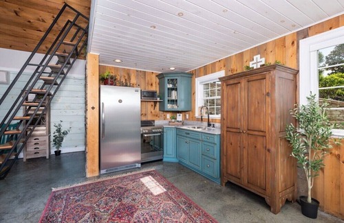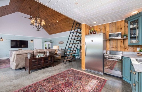 The Pool House is an open-concept space with a lofted bedroom. Below you will find a detailed layout of each space and its amenities: