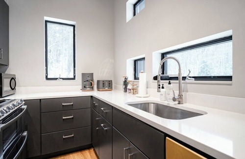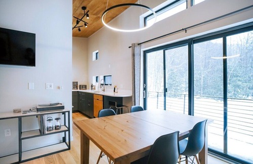 Our unique, 900 square foot contemporary home built in 2022 is in the heart of the Green Mountain National Forest, all while offering all the perks of mid-century modern luxury. Open kitchen, dining and living room. Indoor midcentury wood stove available for guest use. Sunlighten sauna with chromotherapy, perfect for post-ski relaxation. Spectacular views of Ball Mountain Brook. Awesome outdoor area with a deck, fire pit, Adirondack chairs, picnic table and grill. WIFI (200Mbps), dedicated desk / workspace area, 43" smart TV, Nintendo Classic Mini. Four-legged friends welcome!