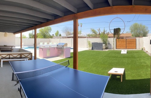 The Prickly Pear sits on the boarder of Scottsdale and Phoenix, a perfect central location to Old Town Scottsdale, downtown Phoenix, Camelback mountain, Tempe and ASU! Oh and just a 7min drive from the airport! The Prickly Pear is set up for your ultimate weekend bash! This boho inspired party pad is a mix of modern chic with a retro glam infusion. House includes its own bangin Spotify playlist, pool, outdoor kitchen, ping pong table, corn hole, 2 smart TVs (one inside and one out), beauty bar and much more!