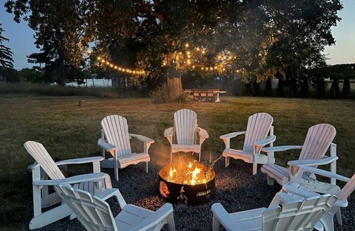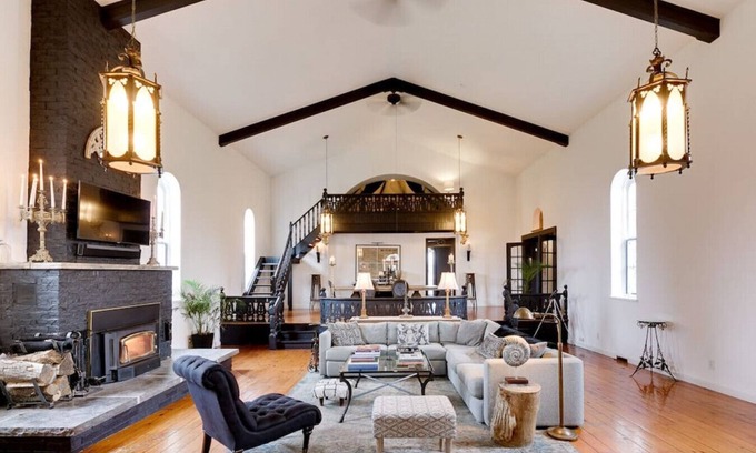Don’t miss this opportunity to stay in this unique stunning space from 1888. The church has a massive communal area with soaring ceilings, huge dining room table, as well as three separate bedrooms. The kitchen has all the modern amenities such as coffee maker fridge microwave stove with plenty of seating. Located on 2.3 acres the backyard has tons of open space and gorgeous trees which backs out onto the water. Massive outdoor area includes dock with 2 kayaks for guest use as well as gorgeous firepit! Indoor and outdoor firewood is included in your stay.