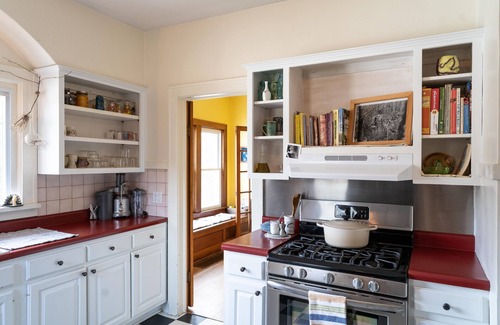 Each bedroom is spacious, private, and outfitted with luxe bedding, lots of pillows, and has at least one window. A cursive typewriter sits in the front bedroom. Built-in shelves provide lots of bedtime reading options. Ceiling fans keep the air moving. Please note that one bedroom has a lofted bed. You can access the bed from stairs, but it is a little funky to manage. It is not an area for small children or boozers to sleep upon. There are two sofas in my home- both are comfortable sleep spots, but neither are pull-out style sofas with proper mattresses. Extra sheets, blankies, and pillows are provided.