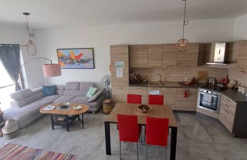 The penthouse has mounted AC units in the living area and both bedrooms for cooling and heating and there are additional fans and heating elements as well. The apertures are double glazed making the internal space a quiet environment. The beds have quality mattrasses and duvets for optimal sleeping comfort. The sizes of the mattrasses are 155 x 190 cm and 150 x 190 cm. The penthouse is further equiped with a washer-dryer combo, drying rack, iron and iron board, hairdryer, vacuum cleaner, built in fridge/freezer, built in oven, induction hob, hob extractor, dishwasher, electric kettle, coffee maker. The kitchen is equipped with pots, pans, plates, cutlery etc. and there are extra blankets for a cozy evening in the sofa. There is a fast WiFi internet connection and extra office chair for those who wish to work during their stay. The dining table is extendable.