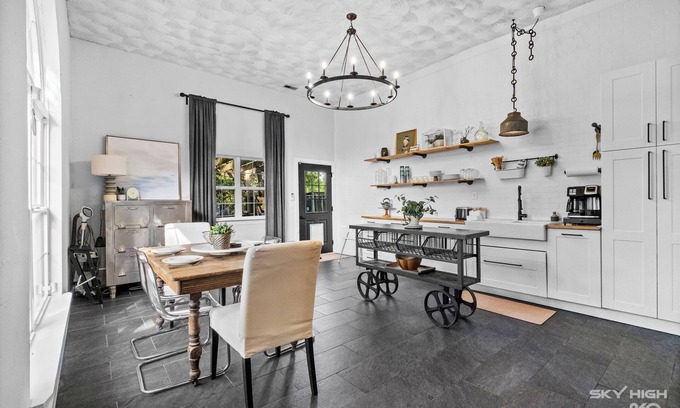 Across the room you go down a few steps to the newly updated, modern industrial, kitchen/dining area. Here you'll find dining for 6 and a fully stocked kitchen for all of your cooking and baking needs. This is also where you'll access the back patio, yard and hot tub! The back yard is fully fenced for your furry travel mates and has lot of fun stuff to do including hammocking, fire pit, outdoor dining area and of course enjoying the massage of the hot tub jets.