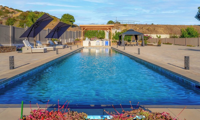 Welcome to The Ranch Malibu! New construction with stunning mountain and ocean views. The beautiful pool has designated lap lane, built in spa, and gourmet outdoor kitchen. Enjoy the garage/gym conversion with a built in steam shower and dry sauna. A media center with a drop-down screen and home theater surround sound is perfect for movie viewing. Fenced in Garden with multiple mature fruit tree's you are welcome to pick. Rooftop deck with firepits and outdoor TV. Inquire about events!