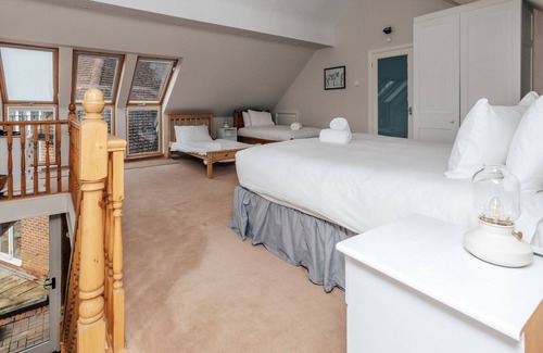 Upstairs, the large bedroom includes a super king bed and two single beds topped with crisp white sheets and snug blankets for a deep and peaceful night's rest. The bathroom features smart white tiles, a walk in shower, toilet and basin.