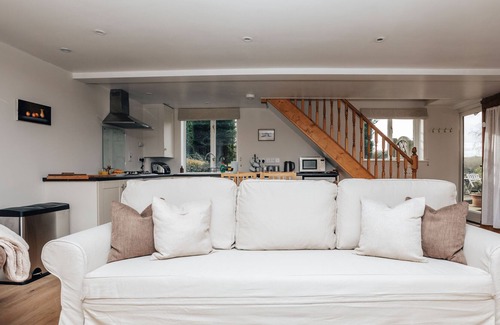 Inside, the annexe is decorated with a chic neutral palette: think soft beige sofas paired with mustard yellow cushions and throws. The living area is open plan and endlessly cosy, furnished with the essential smart TV, and a large, cosy sofa bed with two separate armchairs, ideal for sinking into with a good book. The two stable barn style doors and large windows bring natural light during the day, with soft, warm lighting setting the vibe for the evenings.