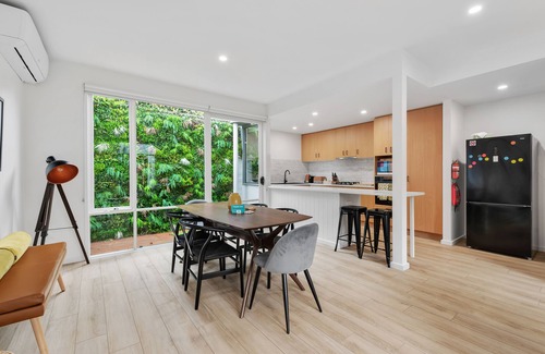 The outdoor area features a table to enjoy the sunshine or share a meal. With its comfortable amenities and convenient location, The Richmond House is the perfect choice for your stay in Melbourne.