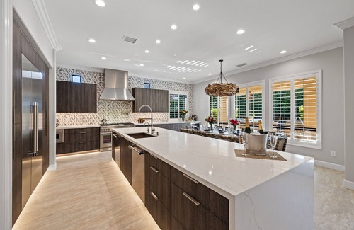 Whip up culinary creations in the stunning outdoor kitchen, complete with a gas grill, cooktop, griddle, warming tray, multiple refrigerators, dishwasher, ice-maker, 5-tap keg system (available for an additional fee), sink, cocktail station, and two 4K outdoor smart TVs. Gather for formal or casual meals at the outdoor dining table that seats 20, or the dining table off the kitchen that seats 12.