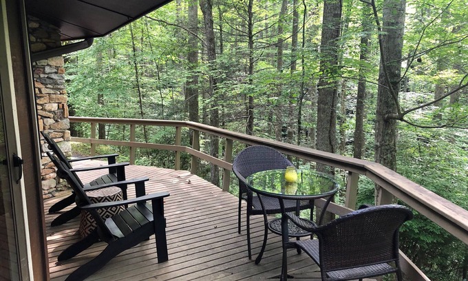 Step back in time to when the Cherokee roamed Appalachia. Upon arrival, you pull into a towering canopy of oak and maple trees and onto a winding driveway. Follow the "To House" sign over the wooden bridge and up to the cabin which is perched overlooking the property. At the top there is parking for two vehicles.