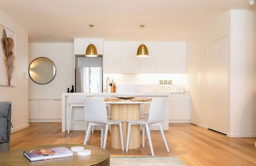 Rest and rejuvenation await in the beautifully appointed bedrooms. The primary bedroom features a king bed and a private ensuite bathroom, ensuring a restful retreat. The second bedroom offers a king bed with the option of two singles upon request, ideal for friends or family. The main bathroom, with its ultra-chic design, gleaming white tiles, and earthy natural timbers, includes a bath and shower combination.