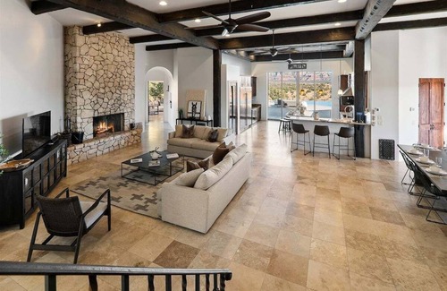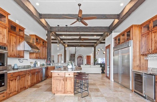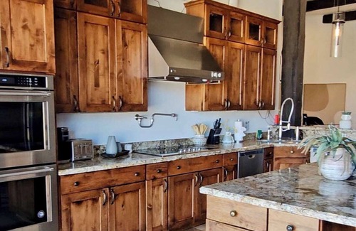 The living and kitchen areas at The Sanctuary at Sacred Mesa offer a perfect blend of comfort and functionality. The bright and open living room is designed for relaxation, featuring designer furnishings, a smart flat-screen TV, a stone electric fireplace, and sub-floor heating for added comfort. The modern, fully equipped kitchen is stocked with all the essentials, including stainless-steel appliances, a GE Monogram refrigerator and freezer, an electric oven and range, and two dishwashers for convenience. Guests can enjoy a morning coffee from the drip or K-Cup coffee makers, whip up meals with the provided cookware and blender, and take advantage of the ice maker. The breakfast bar and dining area provide ample seating, while the kitchen doors open directly to the outdoor patio, seamlessly blending indoor and outdoor living.