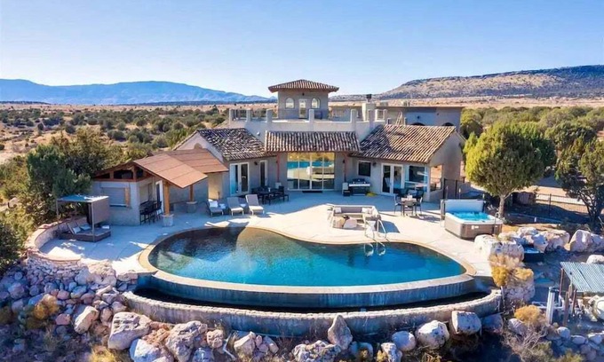 Escape to The Sanctuary at Sacred Mesa, as featured on the season finale of Sister Wives—a breathtaking 6-bedroom retreat with 4 full bathrooms, 2 half baths, and unmatched 180-degree Red Rock views. Perfect for romantic getaways, family reunions, or celebrations, this peaceful haven offers over 3,000 square feet of outdoor living space designed for both relaxation and entertainment. Take a dip in the 45-foot heated infinity pool or unwind in the 8-person hot tub. Test your skills on the 9-hole putting green, or gather on the poolside deck with an outdoor kitchen and bar. Cozy up by the fire pit, rinse off in the outdoor shower, or enjoy games like bocce ball and horseshoes. Inside, the fun continues with a media room, gym, pool table, and ping pong. The open-concept interior features a striking stone fireplace, while the gourmet kitchen boasts high-end appliances, double ovens, a 5-burner stove, and seating for up to twelve. Your stay is hosted by Superhosts Robyn, Jeff, and Tiffany of Arizona Sanctuary Experiences, so you'll have dedicated local hosts ensuring a warm welcome, seamless stay! As a special perk, guests who stay two nights or more can enjoy complimentary golf at Quailwood Greens Golf Course in Prescott, with up to 10 VIP passes included.