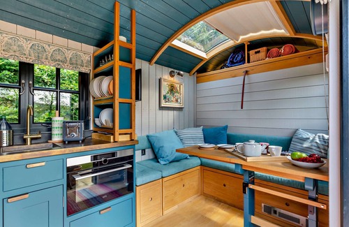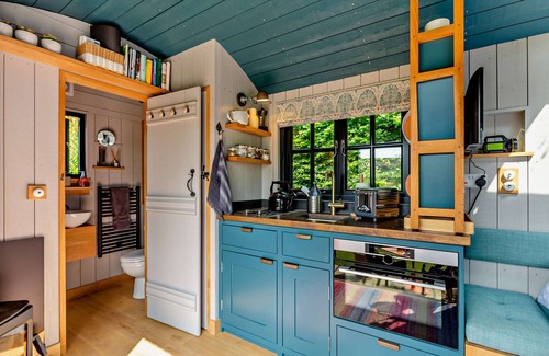 Set in a secret garden with views across the moors of Exmoor, this Shepherds hut has been designed with luxury in mind. This truly is an escape from the humdrum of daily life. The owners have left no attention to detail spared, with luxurious bedding, robes and fluffy slippers. Light the wood burner and snuggle up together with a book or enjoy a romantic movie on the Smart TV. Complete with a gas stove and electric oven, you can enjoy whipping up a favourite recipe and dine together in your cosy Shepherds hut. The pulldown double bed is easy to operate, and completing this cosy escape is a walk-in shower and WC.