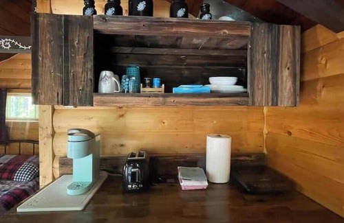 This cabin has NO kitchen; it has a fridge, a microwave, a hot plate and a coffee maker. Outside there is a BBQ with propane, a fire pit and a picnic table.