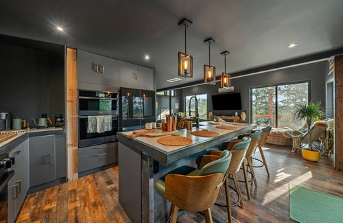 Channel your inner chef in the fully equipped gourmet kitchen, boasting a double oven and a built-in air fryer to help you whip up delicious meals. Enjoy your creations in the dining area or take them outside to the oversized decks. With a BBQ grill and panoramic mountain vistas, these decks are the ideal spot for al fresco dining and evening cocktails.