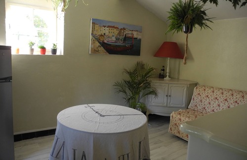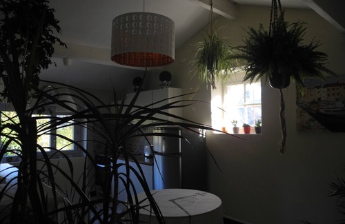 kitchen open to living room of 22m². a small troubleshooting bz serves as a sofa, fridge, microwave, induction hob, coffee maker, kettle, washing machine and dryer. electric heating and fan for summer.