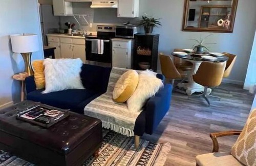 Welcome to our eclectic yet cozy duplex on division street. Centrally located giving guests a variety of walkable things to do while visiting the area. The space has been set up to be functional yet pleasing to the senses. We have a fully stocked kitchen with all you could need for an enjoyable convenient stay. Enjoy the luxury of a king size bed and if additional beds are needed the sofa does fold down to make a bed with a foam pad in the closet to add for extra comfort. There is also an additional fold up single bed in the closet with a memory foam mattress. The TV is a smart Roku tv with all of the apps you could need. Just login to your personal accounts to view. We also have a fully fenced side yard for those who plan to bring their furry friend (please be sure to include in booking) and it is accessible from the front of the property or through the side of the home at bedroom door (See pics). While we are pet friendly we do not allow pets to be left alone at any time during your stay.