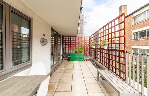 The private terrace offers a tranquil spot to unwind, with views of the surrounding area. Located on the first floor, the flat is easily accessible and provides a peaceful retreat within the city.