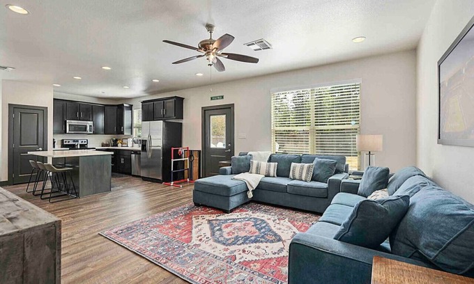 - Gather around the comfortable living room with two couches, one of which transforms into a queen sofa bed, ideal for watching games or movies on the 65" HDTV.