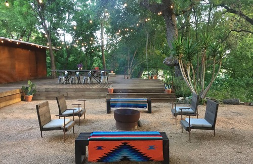 The house is perched on a cliff that overlooks the Medina River and features a giant deck with an outdoor dining table that seats 8, a fire pit tucked in ancient oak trees, a generous screened porch to lounge, and private stairs down to the cypress lined river bottom where guest can enjoy 200' of riverfront to swim, fish, and relax.