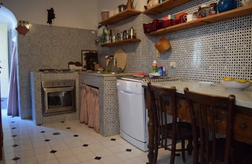 Fully equipped, with marble table and chairs, microwave, oven, gas stove 4 burners, fridge and freezer, shelves and large cupboard, dishwasher, washer
