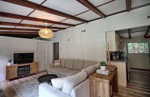 Step into the bright kitchen, featuring ample counter and cupboard space. The adjacent dining area boasts a large dining table, ideal for memorable meals. The kitchen opens into a cozy living area furnished with a couch, chair, TV, and electric fireplace—perfect for movie nights or casual chats. Beyond the living room, three inviting bedrooms comfortably sleep seven guests.