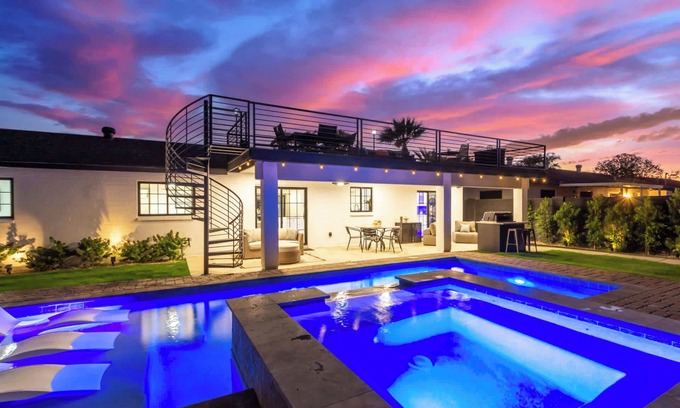 The Sundancer Custom Oasis – A newly renovated 3BR/2BA single-level home in Old Town Scottsdale. Sleeps 8 with a king, queen, and two double beds. Features open-concept living, a modern glass office/laundry, and luxurious baths. The private backyard boasts a deep water pool, 8-person spa, covered patio, and a rooftop terrace. Steps from Scottsdale Stadium, Osborn Park, and minutes to Old Town’s dining and shopping. Perfect for relaxation or exploring the best of Scottsdale!