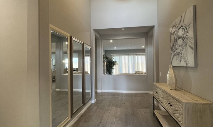 We are only five minutes away from the freeway. The annual gem show is a 20 minute ride from the property. This gorgeous brand new fully upgraded, home that was recently built in 2023 has tall, vaulted ceilings, and 10 foot doors. It is very spacious and grand with a huge concept, kitchen and a massive island. It is equipped with all state of the art appliances and a fully stocked kitchen, which opens up into the living room so you can cook and host and still be involved with all your family and friends. It has 4 bedrooms and 3 full baths. This place is great for large groups with families and kids. All bedrooms but 1 as well as the living room are all equipped with smart TVs for your favorite streaming service. Free WiFi is included. The master bathroom has a huge stone, walk-in shower. The third bedroom has two bunkbeds. Each bunkbed has a twin over full mattress accommodating to sleep up to 6 children. Our home also includes a full-size office in the den where you can set up as your own personal workspace. We also provide Samsung oversized washer and dryer . You will have full access to the enclosed automatic garage with remote. We provide everything that you will need as if this was your own home. Fully stocked with all your needs, toiletries, towels, linens, ect.