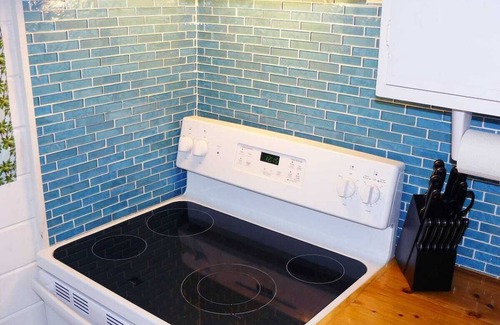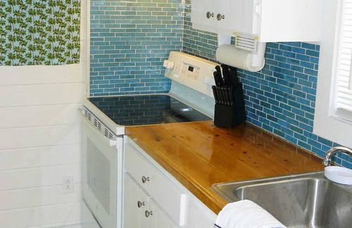 The open concept studio-style cottage is 500 sq ft. The Cottage was built by one of the island’s top builders in late 2018. We furnished it with everything you need to be comfortable- from linens, bath towels, and beach towels to hanging hammock chairs and a beach umbrella with 2 beach chairs. You will find glossy hardwood floors, accent trim work around the doors and windows, 12 foot open beam cathedral ceilings in white with exceptional woodworking. Both the inside and the outside screened porch have ceiling fans along with an ECO friendly 23 seer AC system for robust cooling without much in the way of energy consumption. The roof is brilliant white aluminum which reflects the sun’s rays and transfers heat off the cottage for further cooling. The screen porch has comfortable wicker seating for two and there are also two hanging hammock chairs which guests love. There is a sliding glass door and lots of windows to let in natural light. The cottage has a gorgeous full kitchen with everything you need for cooking complete meals; including a built in microwave, a full size sink, a full size fridge/freezer and a full size range with oven and range hood. The kitchen island has 4 stools for seating. There is a beautiful aqua colored glass tile backsplash above the counters with complimenting 3 glass hanging pendant lights for a romantic lighting effect. The cabinets are hand crafted island-style with 100% real wood inside and out along with beautiful bar-style wooden countertops with a heavy clear shellac. The living area is open to the kitchen and has a small but comfortable love seat and a coffee table with a wall mounted flat screen TV. There is a smart TV. There are also some games such as Jenga, Dominoes and playing cards. The bathroom is fully enclosed, with walls going to the ceilings for privacy, along with a pretty spacious tile walk in shower. There is an exterior commercial "park style" charcoal grill for your fresh seafood. An added bonus is our outdoor shower. A note - there is no hot water in the outside shower, but hey it's a tropical island right? And of course, yes we have hot water inside the cottage in all sinks and the shower.