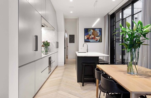 | Full kitchen with Miele appliances and stone island bench — great for cooking or entertaining