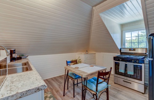 Unit 7 - “The Tree House Room” is on the 3rd level (top floor) and is approx. 350 sq ft with 1 bed/1 bath. This space has 1 mid-size bedroom with a queen-size bed, small dining table, 39” TV, a bathroom with a stand-up shower, and a full kitchen for your use and enjoyment. The space is up high and closest to the canopy of the very old pine tree in the back giving you the feel of being up high in a tree house.