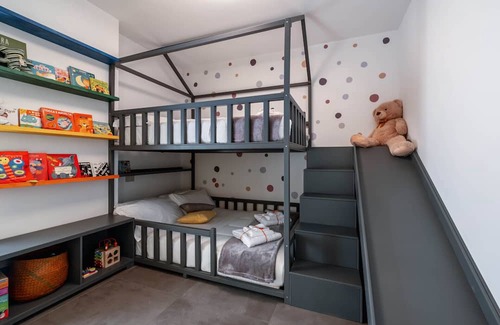 The apartment opens onto a large living room, where the dining area blends harmoniously with the fully equipped kitchen and a cozy sofa. At guests' disposal there is a 120-inch cinema projector thanks to which you can enjoy watching a good movie. Two bedrooms await you: a spacious double bedroom with private bathroom, and a bedroom with a fun bunk bed, consisting of two French mattresses. An additional bathroom completes the comfort of the guests.