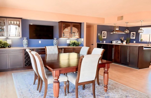 This unique home is divided into two separate units, each boasting its own private patio. The private master suite features a spacious living room, a convenient laundry room, a cozy gas fireplace, and a fully equipped kitchen. On the other side of the house, you'll find two comfortable bedrooms, one with its own en-suite bathroom, and an additional separate full bath. This side of the house also showcases a great room, complete with a large bar stocked with glassware and a wine fridge, a charming dining room, and yet another full kitchen.